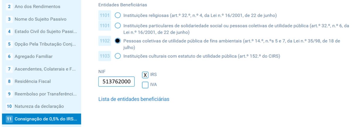 - assinalar a opção “1102 Pessoas coletivas de utilidade pública de fins ambientais”
