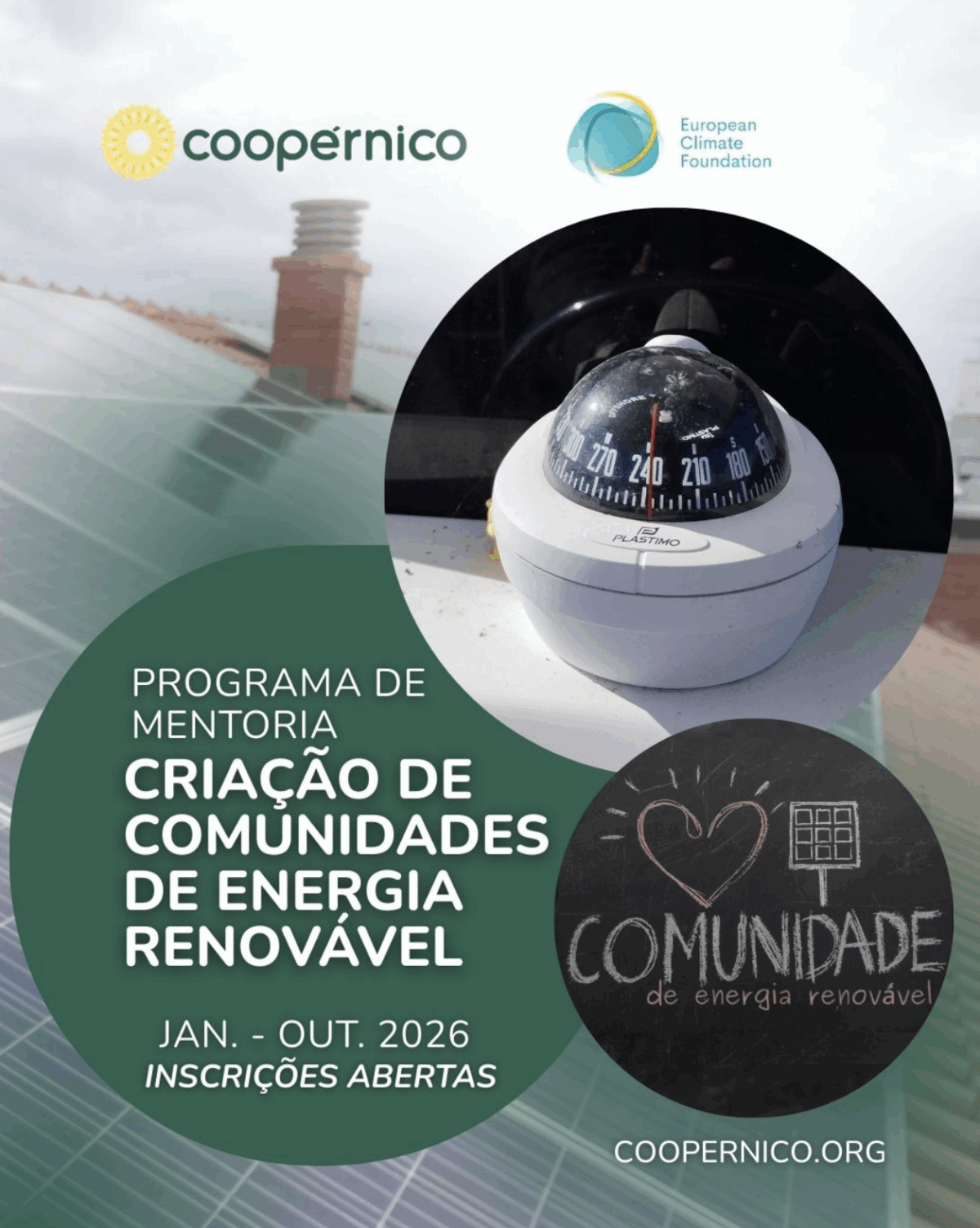 A cooperativa Coopérnico oferece em janeiro de 2026 um programa gratuito de mentoria para grupos de cidadãos e associações locais interessados na criação de Comunidades de Energia Renovável. O programa decorre até outubro de 2026, com uma sessão individual por semana e uma sessão conjunta por mês, seguindo os 10 passos do Guia Prático da Parceria Local de Telheiras. Estão disponíveis até 10 vagas, preenchidas por ordem de inscrição, com prioridade para diversidade territorial e motivação. Inscreva-se já, até dia 10 de janeiro!
