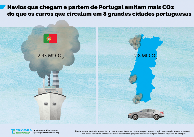Segundo o estudo da T&E, as emissões dos navios de mercadorias que chegam e partem de Portugal emitem mais dióxido de carbono para a atmosfera do que as emissões associadas ao tráfego rodoviário das oito cidades portuguesas com maior número de automóveis registados.