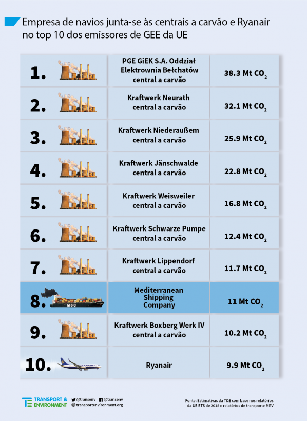 Um estudo hoje apresentado pela Federação Europeia para os Transportes e Ambiente (T&E) [1], da qual a ZERO faz parte, denuncia que a frota da Mediterranean Shipping Company (MSC), que movimenta bens de consumo, desde produtos elétricos e eletrónicos, frutas frescas, roupas a brinquedos, foi responsável pela emissão de cerca de 11 milhões de toneladas (Mt) de CO2 em 2018. Se o transporte marítimo integrasse o regime de comércio de licenças de emissão da União Europeia (UE) (o que atualmente não se verifica), a MSC seria o oitavo maior emissor na lista dos dez maiores poluidores europeus, um grupo também integrado por várias centrais a carvão e pela companhia aérea Ryanair.