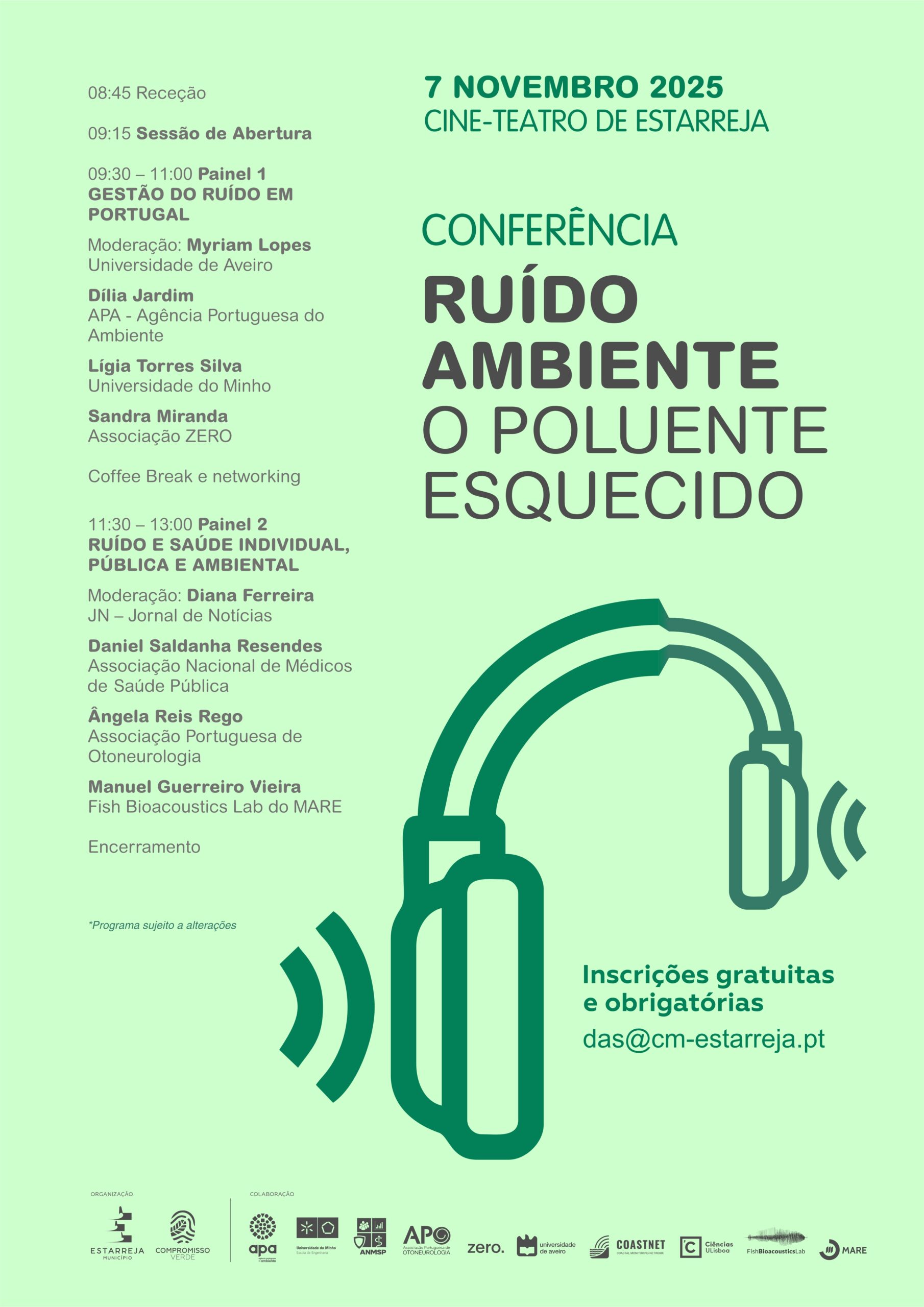 O evento, organizado pela Câmara Municipal de Estarreja no âmbito do Compromisso Verde, conta com a colaboração da ZERO, APA – Agência Portuguesa do Ambiente, Universidade de Aveiro, Universidade do Minho, ANMSP – Associação Nacional dos Médicos de Saúde Pública, APO – Associação Portuguesa de Otoneurologia, entre outras entidades.
