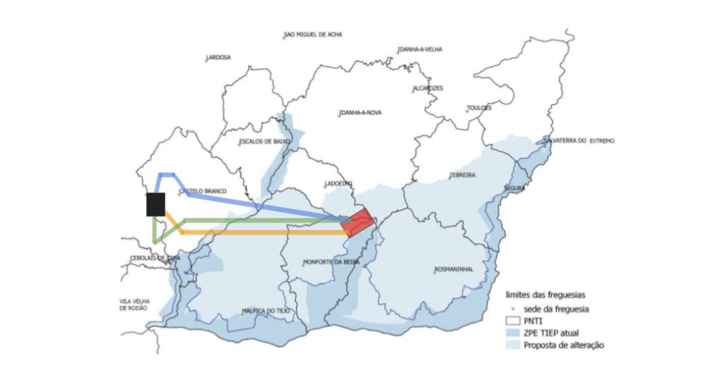 Figura 1: Área proposta para alteração dos limites da ZPE TIEP em relação à atual ZPE TIEP, enquadrada com o layout do projeto em análise (retirado figura 14 do relatório “Proposta De Alteração Dos Limites Da ZPE TIEP” pelo ICNF, janeiro 2018). Como se pode verificar o projeto e grande parte da linha elétrica encontrar-se-ia integralmente dentro da ZPE proposta pelo ICNF e parcialmente do parque natural.