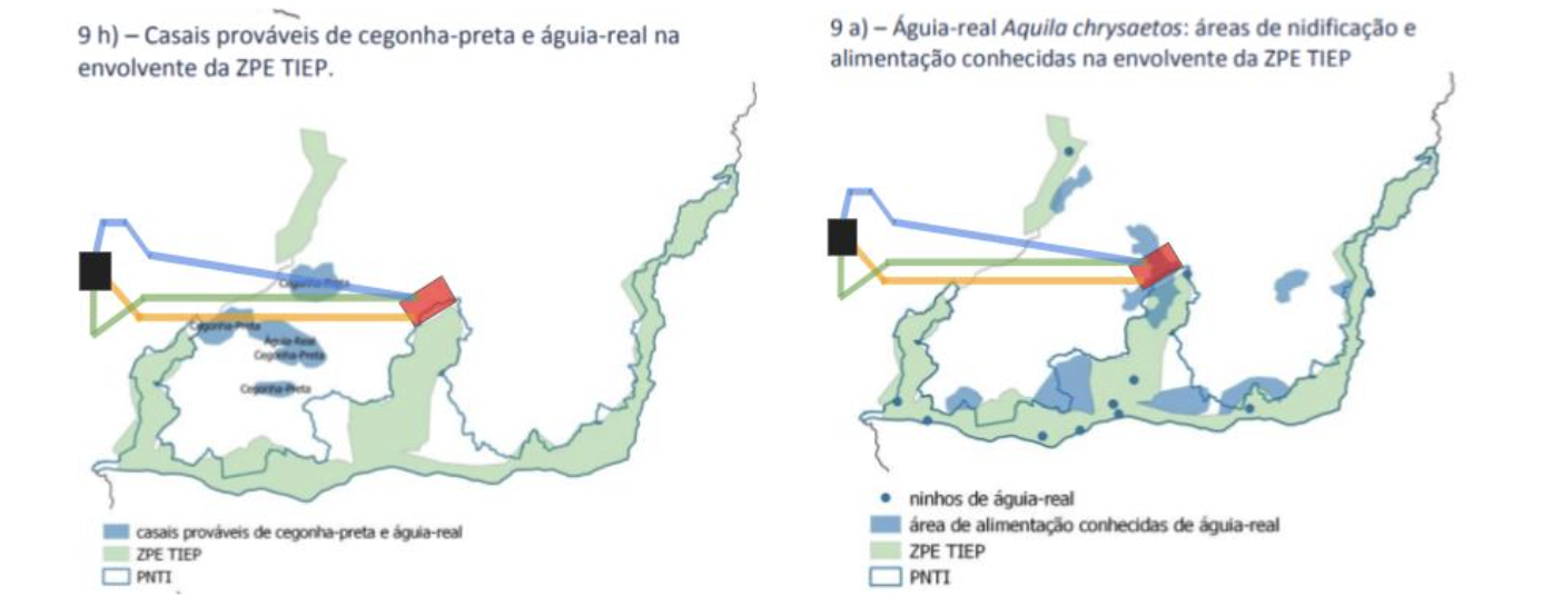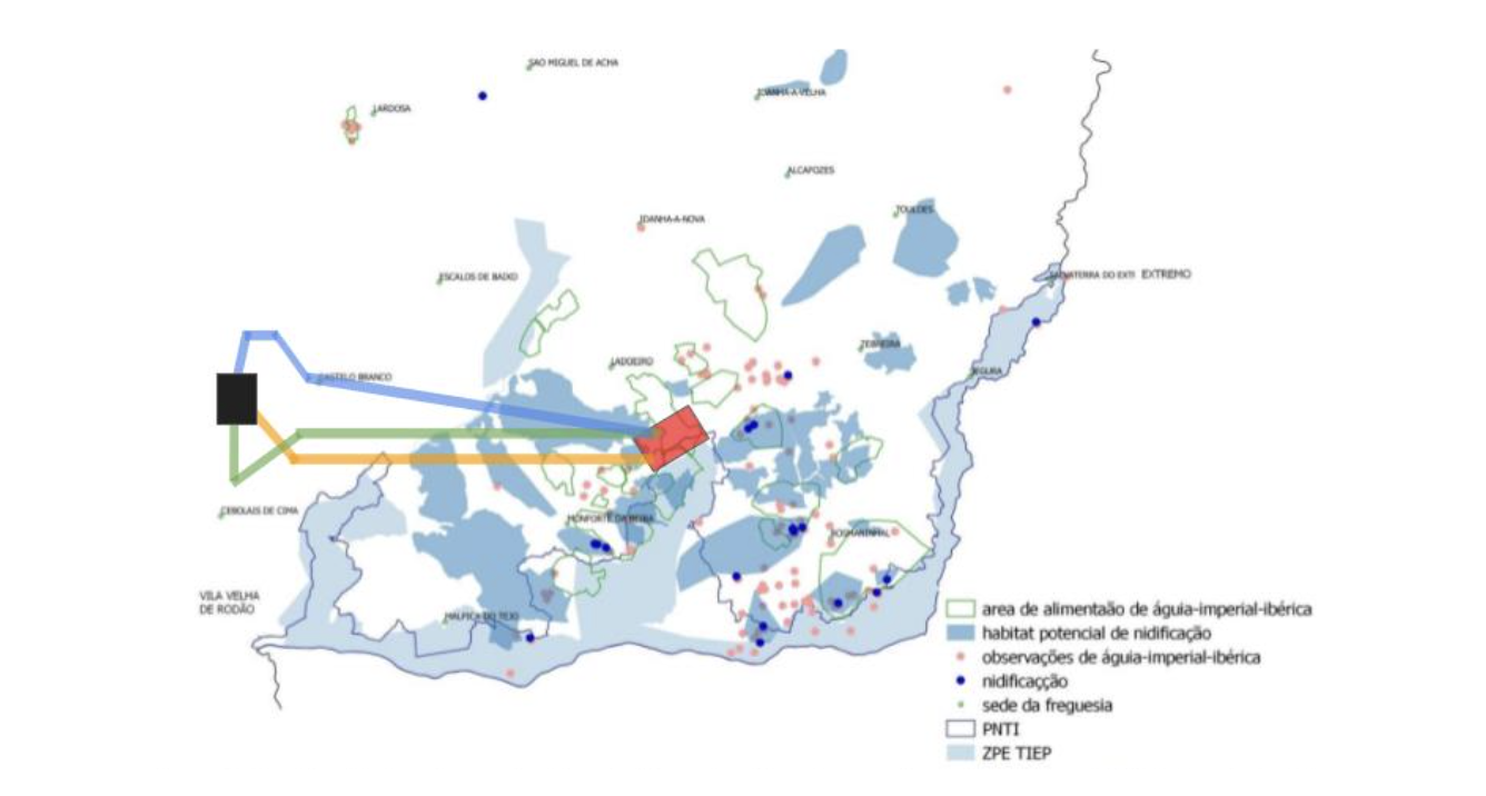 Figura 3: Enquadramento do layout do projeto em análise com a áreas de ocorrências de cegonha-preta e águia-real (retirado da figura 9 h) e 9 a) do relatório “Proposta De Alteração Dos Limites Da ZPE TIEP” pelo ICNF, janeiro 2018). Mais uma vez observam-se as fortes sobreposições com a presença de casais de cegonha-preta (Em Perigo) e águia-real (Em Perigo) e da central com áreas de nidificação e alimentação conhecidas de águia-real