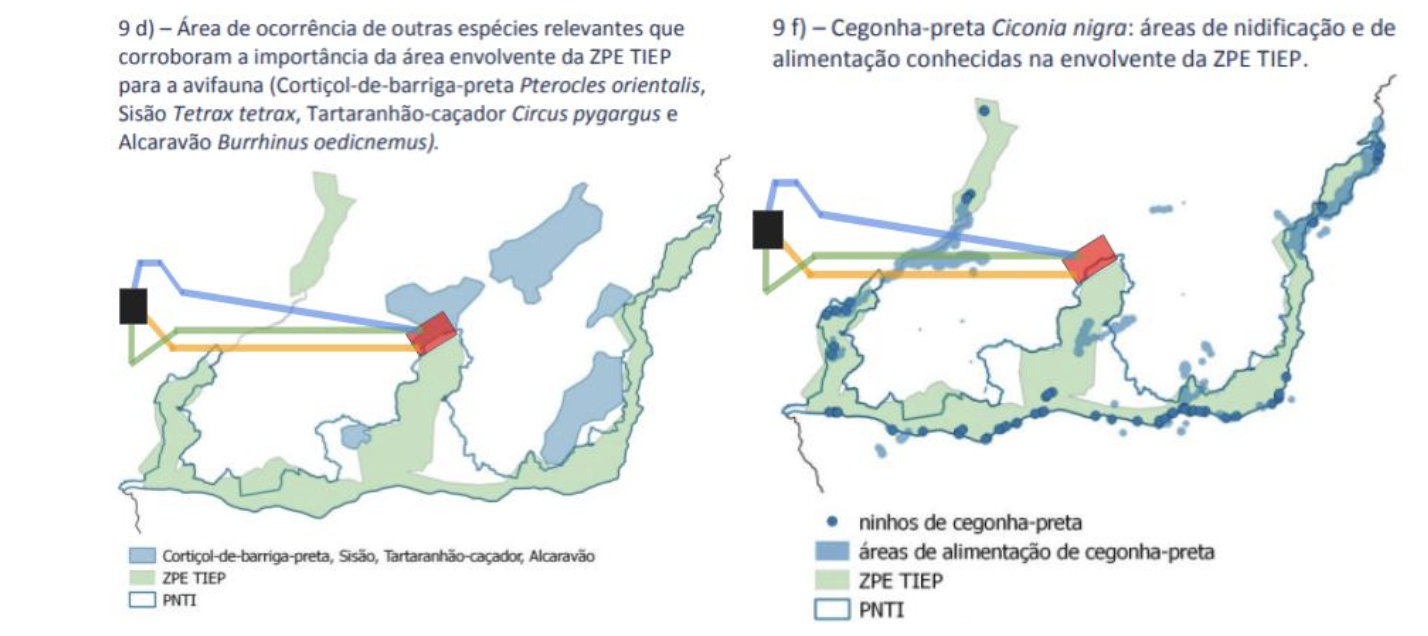 Figura 2: Enquadramento do layout do projeto em análise com a áreas de ocorrências de espécies relevantes do ponto de vista de conservação, incluindo o cortiçol-de-barriga-preta, sisão, tartaranhão-caçador e alcaravão, com especial enfoque na cegonha-preta – na figura da direita (retirado da figura 9 d) e 9 f) do relatório “Proposta De Alteração Dos Limites Da ZPE TIEP” pelo ICNF, janeiro 2018). Pode se verificar que a área da central coincide grandemente com uma grande área de ocorrência de espécies relevantes e que a linha elétrica atravessaria totalmente (sem ser possível desviar) uma linha de áreas de alimentação de cegonha-preta (Em Perigo)