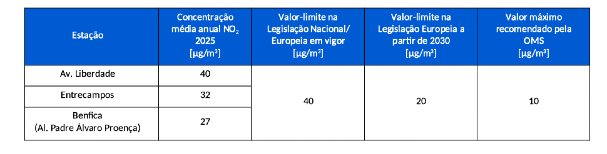 Porém, apesar do cumprimento da legislação em 2025, todos os locais de tráfego analisados mantiveram-se problemáticos em termos da concentração de NO2. A ZERO alerta que os valores apresentados são duas a quatro vezes superiores ao valor máximo recomendado pela Organização Mundial da Saúde (OMS). Já em relação ao valor legal que entrará em vigor a partir de 2030 (20 μg/m3), os valores medidos excedem-no amplamente – no caso da Av. da Liberdade em 100% (é o dobro), no caso de Entrecampos em cerca de 60%, e no caso de Benfica em cerca de 35%, pelo que a Câmara Municipal de Lisboa dispõe de quatro anos para reduzir drasticamente os níveis de poluição por dióxido de azoto.