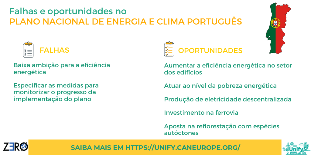 No plano português verificou-se que a maior falha está na baixa ambição ao nível da eficiência energética. Porém, ao mesmo tempo, apresenta oportunidades para uma maior atuação a este nível, principalmente na área dos edifícios (que tem sido muito reduzida), e ao nível da pobreza energética, realidade que finalmente começa a ser reconhecida em Portugal. Outras oportunidades importantes que se destacam no plano português são a produção de eletricidade renovável descentralizada (até pela recente criação das denominadas comunidades de energia), um maior investimento na ferrovia a nível nacional e nas ligações com Espanha e Europa (que a semana passada teve um importante revés ao nível do transporte de passageiros) e ainda na aposta na reflorestação com espécies autóctones, com vista a uma maior resiliência aos incêndios.